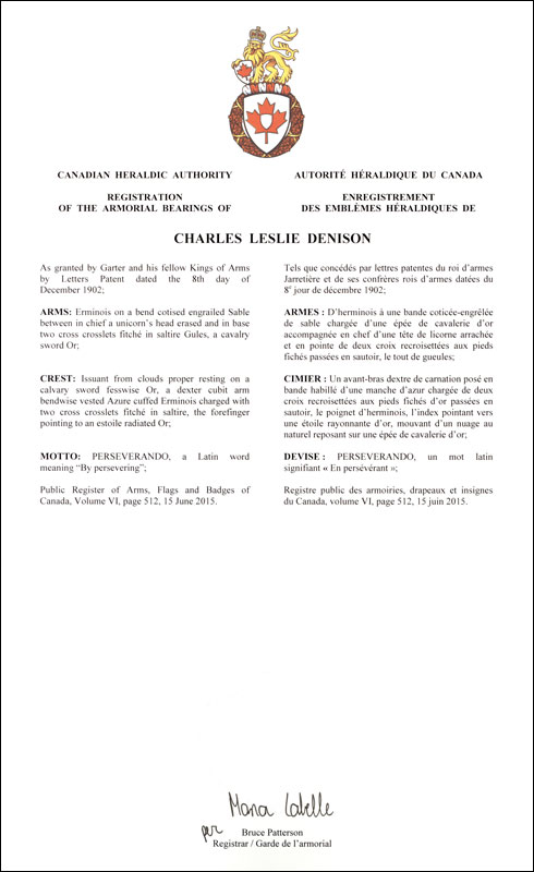 L'utilisation du contenu du Registre public est réservée à des fins de recherche uniquement. Les emblèmes héraldiques du Registre ne peuvent être reproduits sous aucune forme ou par quelque procédé que ce soit sans l'autorisation écrite de l'Autorité héraldique du Canada et/ou du récipiendaire.