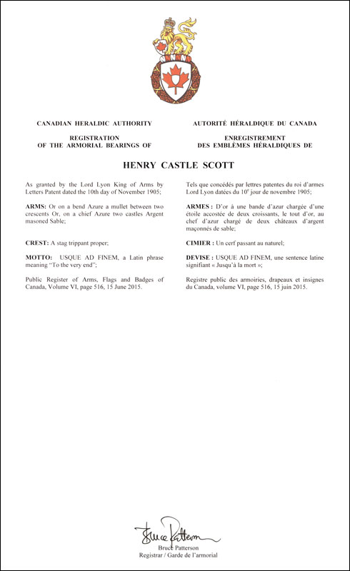 L'utilisation du contenu du Registre public est réservée à des fins de recherche uniquement. Les emblèmes héraldiques du Registre ne peuvent être reproduits sous aucune forme ou par quelque procédé que ce soit sans l'autorisation écrite de l'Autorité héraldique du Canada et/ou du récipiendaire.