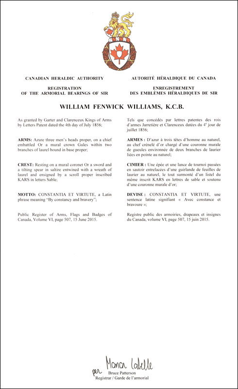 L'utilisation du contenu du Registre public est réservée à des fins de recherche uniquement. Les emblèmes héraldiques du Registre ne peuvent être reproduits sous aucune forme ou par quelque procédé que ce soit sans l'autorisation écrite de l'Autorité héraldique du Canada et/ou du récipiendaire.
