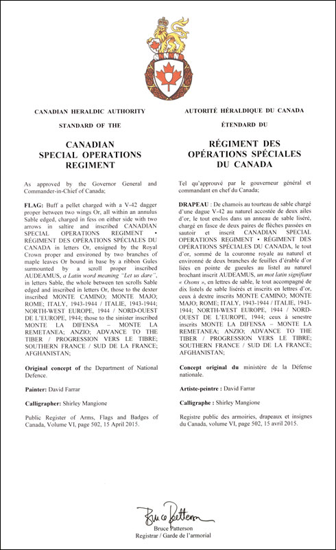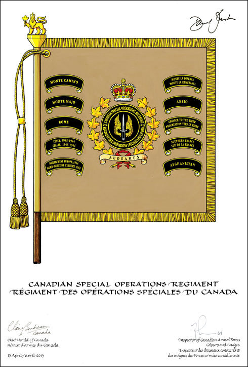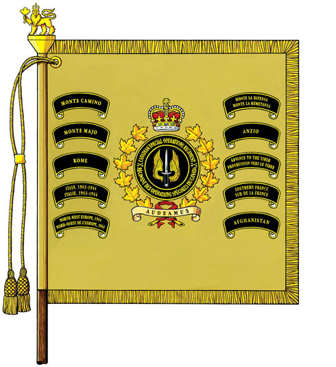 Étendard du Régiment des opérations spéciales du CanadaBlasonDe chamois au tourteau de sable chargé d’une dague V-42 au naturel accostée de deux ailes d’or, le tout enclos dans un anneau de sable liséré, chargé en fasce de deux paires de flèches passées en sautoir et inscrit CANADIAN SPECIAL OPERATIONS REGIMENT • RÉGIMENT DES OPÉRATIONS SPÉCIALES DU CANADA, le tout d’or, sommé de la couronne royale au naturel et environné de deux branches de feuilles d’érable d’or liées en pointe de gueules au listel au naturel brochant inscrit AUDEAMUS, un mot latin signifiant « Osons », en lettres de sable, le tout accompagné de dix listels de sable lisérés et inscrits en lettres d’or, ceux à dextre inscrits MONTE CAMINO; MONTE MAJO; ROME; ITALY, 1943-1944 / ITALIE, 1943-1944; NORTH-WEST EUROPE, 1944 / NORD-OUEST DE L’EUROPE, 1944; ceux à senestre inscrits MONTE LA DIFENSA – MONTE LA REMETANEA; ANZIO; ADVANCE TO THE TIBER / PROGRESSION VERS LE TIBRE; SOUTHERN FRANCE / SUD DE LA FRANCE; AFGHANISTAN; SymbolismeSans objet. |