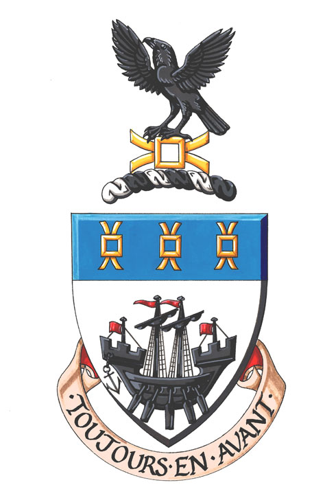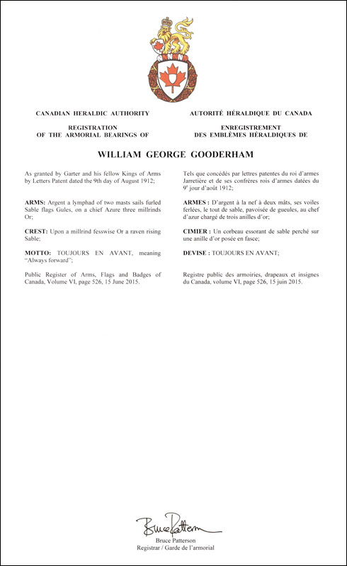 Armoiries de William George GooderhamBlasonD’argent à la nef à deux mâts, ses voiles ferlées, le tout de sable, pavoisée de gueules, au chef d’azur chargé de trois anilles d’or; SymbolismeNon disponible. |