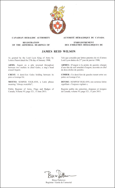 L'utilisation du contenu du Registre public est réservée à des fins de recherche uniquement. Les emblèmes héraldiques du Registre ne peuvent être reproduits sous aucune forme ou par quelque procédé que ce soit sans l'autorisation écrite de l'Autorité héraldique du Canada et/ou du récipiendaire.