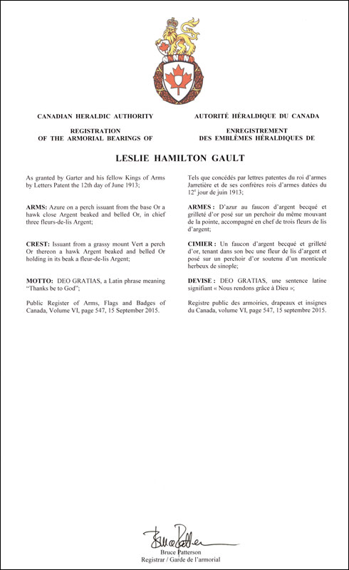 L'utilisation du contenu du Registre public est réservée à des fins de recherche uniquement. Les emblèmes héraldiques du Registre ne peuvent être reproduits sous aucune forme ou par quelque procédé que ce soit sans l'autorisation écrite de l'Autorité héraldique du Canada et/ou du récipiendaire.