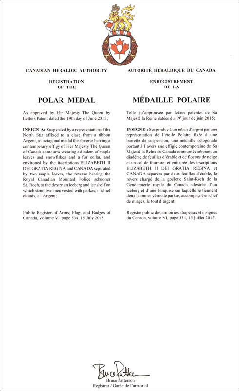 Autres renseignementsLa médaille polaire a été approuvée par lettres patentes de Sa Majesté la Reine datées du 19e jour de juin 2015; |
