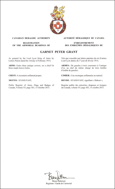 Armoiries de Garnet Peter GrantBlasonDe gueules à trois couronnes à l’antique d’or, au chef du même chargé de trois feuilles d’érable de gueules; SymbolismeNon disponible. |