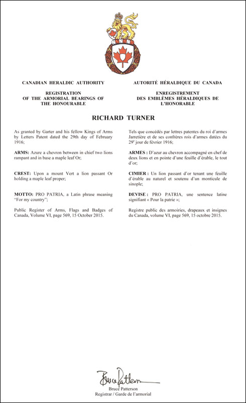 Armoiries de Richard TurnerBlasonD’azur au chevron accompagné en chef de deux lions et en pointe d’une feuille d’érable, le tout d’or; SymbolismeNon disponible, |