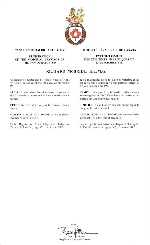 Informations additionnellesCréateur(s)Non disponible. Artiste-peintreArtist of the College of Arms, London / Artiste du Collège d’armes, Londres CalligrapheSans objet Type de récipiendaireIndividuel Autres renseignementsLes emblèmes du récipiendaire ont été précédemment consignés dans les archives du Collège d’armes, Londres, Angleterre, le 20 novembre 1913. Sir Richard McBride a été premier ministre de Colombie-Britannique de 1903 à 1915. |
