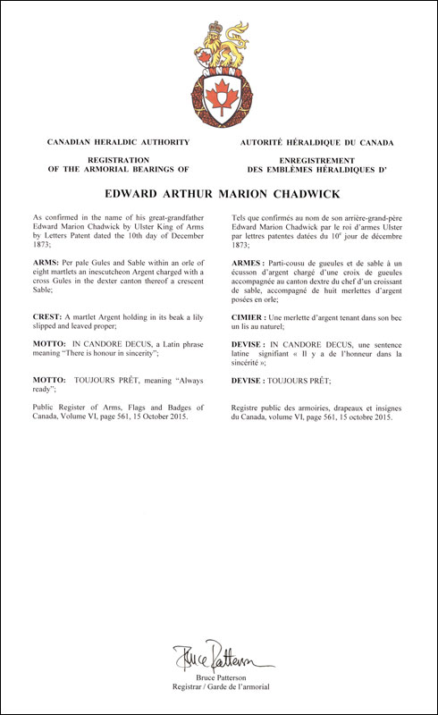 Informations additionnellesCréateur(s)Non disponible. Artiste-peintreOffice of Ulster King of Arms, Dublin / Bureau du roi d’armes Ulster, Dublin CalligrapheSans objet Type de récipiendaireIndividuel Autres renseignementsLes emblèmes du récipiendaire ont été précédemment consignés par le roi d’armes Ulster, Dublin, Irlande, le 10 décembre 1873, au nom de son arrière-grand-père Edward Marion Chadwick. |