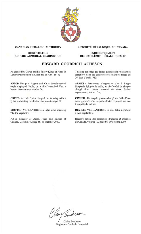 L'utilisation du contenu du Registre public est réservée à des fins de recherche uniquement. Les emblèmes héraldiques du Registre ne peuvent être reproduits sous aucune forme ou par quelque procédé que ce soit sans l'autorisation écrite de l'Autorité héraldique du Canada et/ou du récipiendaire.