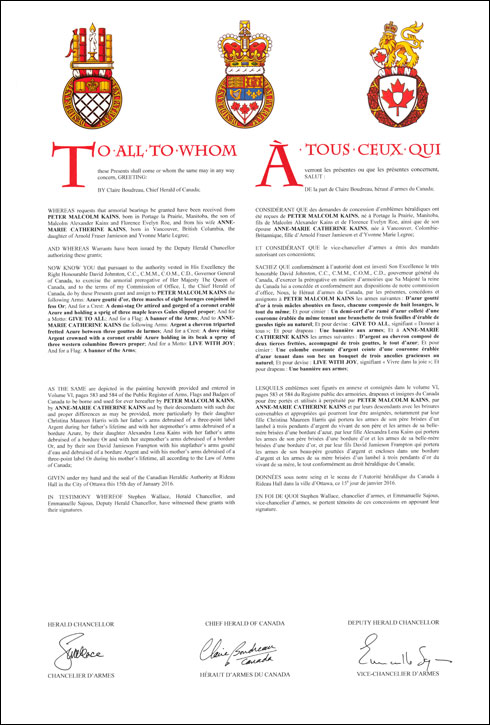 Armoiries d'Anne-Marie Catherine KainsBlasonD’argent au chevron composé de deux tierces frettées, accompagné de trois gouttes, le tout d’azur; SymbolismeLes chevrons représentent les montagnes de la Colombie-Britannique, où réside Mme Kains. Entrelacés, ils font référence à sa famille recomposée, à sa carrière en télécommunications et à son intérêt pour l’interdépendance des enjeux locaux et mondiaux. Les gouttelettes évoquent à la fois la mer, à proximité de son domicile, et ses trois enfants. |