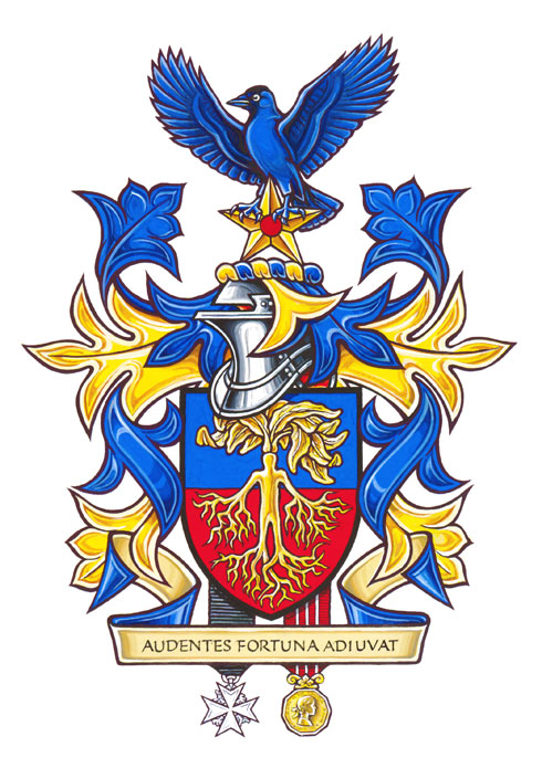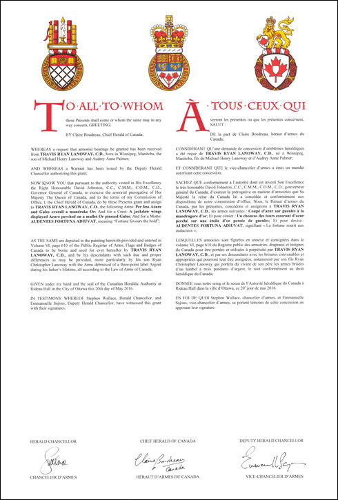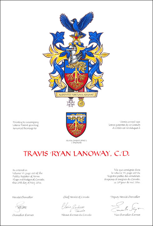 Armoiries de Travis Ryan LanowayBlasonCoupé d’azur sur gueules à la mandragore d’or; SymbolismeLes couleurs du champ rappellent les origines familiales de M. Lanoway : le bleu et le rouge sont inspirés des armes du royaume de Galicie, d’où venaient ses ancêtres paternels dans l’Empire d’Autriche, et le bleu et le jaune sont les couleurs nationales de l’Ukraine, d’où vient sa lignée maternelle. La mandragore, une plante utilisée au Moyen Âge pour ses propriétés anesthésiques, met à l’honneur le travail de M. Lanoway en tant que secouriste paramédical. Le légume-racine fourchu qui évoque une silhouette humaine était réputé posséder des vertus magiques et pousser un cri perçant lorsqu’il était tiré du sol. Dans son rôle de technicien de l’évacuation aéromédicale en zone de guerre, M. Lanoway a été appelé à tirer des soldats gravement blessés de situations difficiles sur le terrain. |