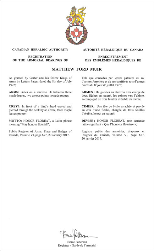 Armoiries de Matthew Ford MuirBlasonDe gueules au chevron d’or chargé de deux flèches au naturel, les pointes vers l’abîme, accompagné de trois feuilles d’érable du même; SymbolismeNon disponible. |