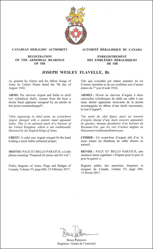Armoiries de Joseph Wesley FlavelleBlasonDivisé en chevron d’argent à deux cartouches cylindriques de sable sur sable à une main dextre appaumée mouvante de la pointe accompagnée en abîme d’une étoile rayonnante, le tout d’argent*; *Au point du chef figure aussi un écusson d’argent chargé d’une main senestre appaumée de gueules, marque facultative d’un baronnet du Royaume-Uni, que les rois d’armes anglais ne blasonnent traditionnellement pas. SymbolismeNon disponible. |