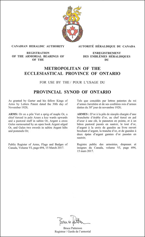 Enregistrement d’armoiries pour l'usage du Provincial Synod of Ontario