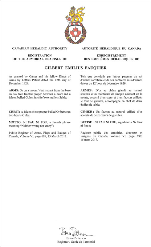 L'utilisation du contenu du Registre public est réservée à des fins de recherche uniquement. Les emblèmes héraldiques du Registre ne peuvent être reproduits sous aucune forme ou par quelque procédé que ce soit sans l'autorisation écrite de l'Autorité héraldique du Canada et/ou du récipiendaire.