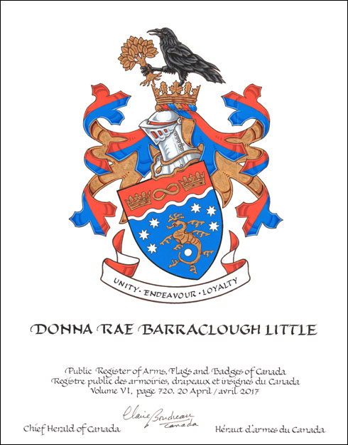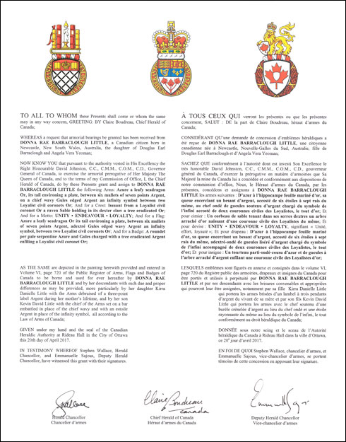 DeviseBlasonUNITY • ENDEAVOUR • LOYALTY; SymbolismeSignifiant « Unité, effort, loyauté », ces trois importants préceptes pour Mme Little et ses enfants font respectivement référence à son appartenance à l’United Empire Loyalist Association of Canada, au NSM Endeavour commandé par James Cook et, par conséquent, à la Captain James Cook Elementary School que ses enfants ont fréquentée, et à sa loyauté à la Couronne, au pays, à la famille et aux amis. |