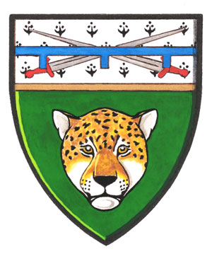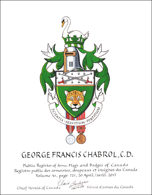 Armoiries de George Francis ChabrolBlasonDe sinople au masque de jaguar au naturel, au chef d’hermine soutenu d’or chargé de deux épées passées en sautoir au naturel garnies de gueules; SymbolismeLe jaguar, tiré des armes du Guyana, symbolise la naissance de M. Chabrol en Guyane britannique. Le vert est la couleur de l’uniforme de l’Armée canadienne. Les épées représentent son service au sein des Forces armées canadiennes. La fourrure d’hermine, qui se caractérise par sa douceur, représente la nature bienveillante de M. Chabrol. |