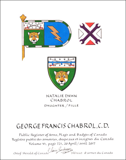 Concession d’armoiries, d’un drapeau et d’un insigne, avec brisures à Natalie Dawn Chabrol