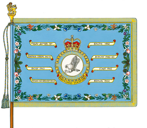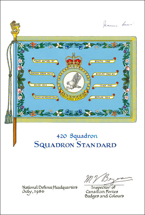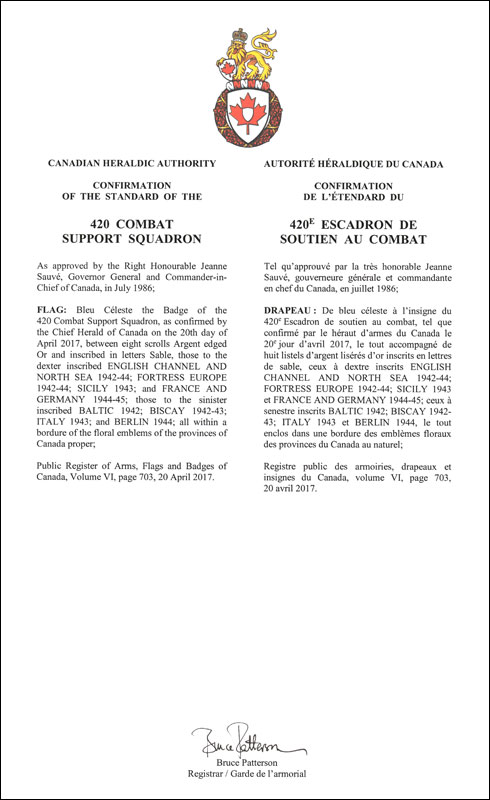 Étendard du 420e Escadron de soutien au combatBlasonDe bleu céleste à l’insigne du 420e Escadron de soutien au combat, tel que confirmé par le héraut d’armes du Canada le 20e jour d’avril 2017, le tout accompagné de huit listels d’argent lisérés d’or inscrits en lettres de sable, ceux à dextre inscrits ENGLISH CHANNEL AND NORTH SEA 1942-44; FORTRESS EUROPE 1942-44; SICILY 1943 et FRANCE AND GERMANY 1944-45; ceux à senestre inscrits BALTIC 1942; BISCAY 1942-43; ITALY 1943 et BERLIN 1944, le tout enclos dans une bordure des emblèmes floraux des provinces du Canada au naturel; SymbolismeNon disponible. |
