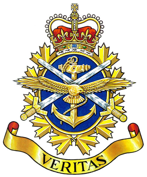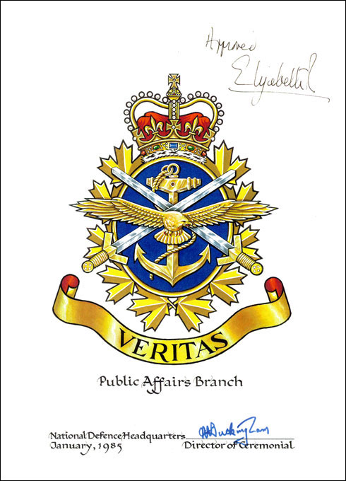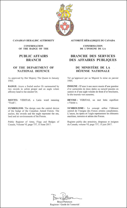 Insigne de la Branche des services des affaires publiquesBlasonD’azur à une ancre munie d’une gumène d’or surmontée de deux épées au naturel passées en sautoir et d’une aigle volante de front d’or brochante, la tête tournée vers senestre; SymbolismeLe concept utilise l’élément central de l’insigne des Forces armées canadiennes. L’ancre, les épées et l’aigle représentent les éléments maritime, terrestre et aérien des Forces. |