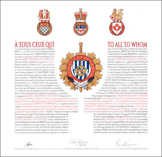 Insigne du Musée canadien de l’histoireBlasonL’écu des armes du Musée canadien de l’histoire tel que confirmé dans le volume VI, page 714 (Palé-contre-palé-ondé d’argent et d’azur à l’astrolabe d’or), entouré d’un anneau de gueules inscrit SCIENTIA ET SAPIENTIA, signifiant « Science et sagesse », en lettres d’or, soutenu de deux plumes d’aigle au naturel passées en sautoir, le tout brochant sur une épée d’or posée en pal, la pointe en pointe, environnée d’une guirlande de feuilles d’érable du même; SymbolismeLes lignes verticales incarnent la chute de la Chaudière, que l’explorateur français Samuel de Champlain a décrite lors de sa remontée de la rivière des Outaouais en 1613, près du site actuel du Musée canadien de l’histoire. L’eau représente les ressources naturelles du pays en plus de rappeler l’importance des cours d’eau, qui ont été pendant des siècles les principales voies d’échange et de communication pour les Autochtones comme pour les colons européens. L’astrolabe, symbole des explorations européennes, représente l’instrument que Champlain aurait perdu lors de son expédition au pays des Hurons et qui se trouve dans les collections du musée. Si l’écu désigne plus spécifiquement le Musée canadien de l’histoire, l’épée, symbole militaire, renvoie au Musée canadien de la guerre, une société affiliée. Les plumes d’aigle sont un emblème autochtone et mettent à l’honneur les premiers peuples de la région. Les feuilles d’érable incarnent le Canada. |