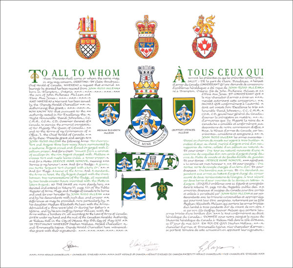 Concession d’armoiries, de drapeaux et d’un insigne, avec brisures à Meaghan Elizabeth McLean et à Geoffrey Spencer McLean