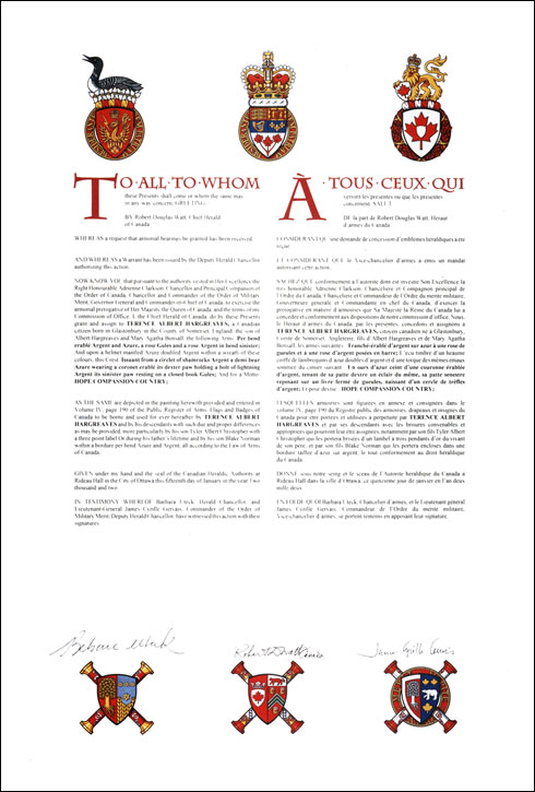 Armoiries de Terence Albert HargreavesBlasonTranché-érablé d'argent sur azur à une rose de gueules et à une rose d'argent posées en barre; SymbolismeLes couleurs bleu et blanc rappellent le lien de la famille avec la mer. La ligne de partition en feuilles d’érable représente à la fois la vie de M. Hargreaves au Canada et les échanges entre le français et l’anglais. La rose blanche et la rose rouge désignent ses origines nordiques anglaises. |