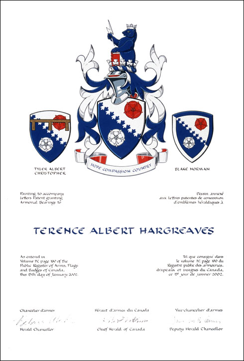Concession d'armoiries, avec brisures à Tyler Albert Christopher Hargreaves et à Blake Norman Hargreaves
