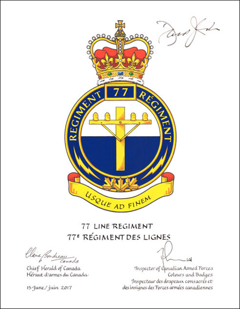 Insigne du 77e Régiment des LignesBlasonCoupé d’argent sur azur à un poteau téléphonique d’or; SymbolismeLe blanc et le bleu sont les couleurs du Corps royal canadien des transmissions. Le poteau téléphonique est repris de l’insigne de la 1re Troupe de poseurs de ligne, un des prédécesseurs de l’unité. La devise est la traduction latine de la devise anglaise de la 1re Troupe de poseurs de ligne (« Through »). |