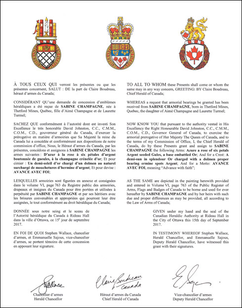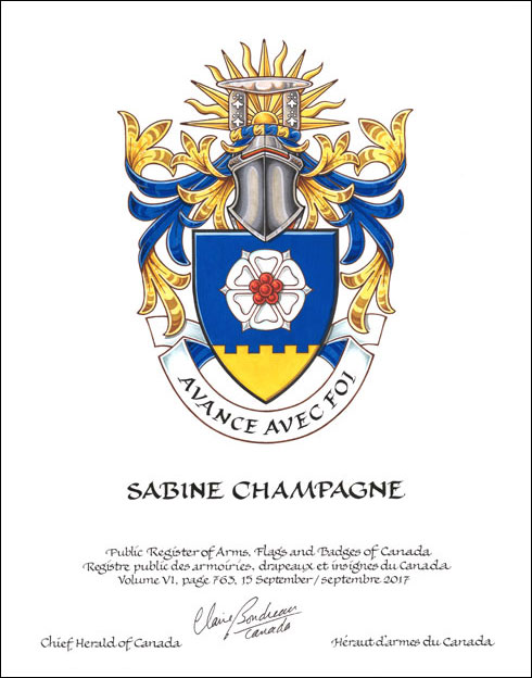 DeviseBlasonAVANCE AVEC FOI; SymbolismeCette expression évoque l’esprit d’entreprise de Mme Champagne et de sa famille. |