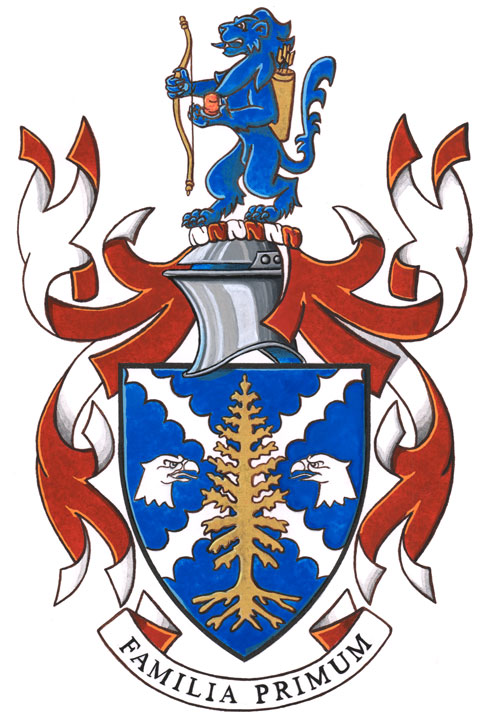 CimierBlasonUn lion arrêté d’azur empoignant de sa patte dextre un arc d’or, soutenant dans sa patte senestre une cornaline au naturel et portant dans son dos un carquois rempli de flèches, le tout d’or; SymbolismeLe lion fait allusion à l’Écosse et la pierre de cornaline symbolise l’espoir et la patience. L’accoutrement d’archer est inspiré de celui des supports du chef des Macfarlane, qui sont deux Highlanders armant leurs arcs. |
