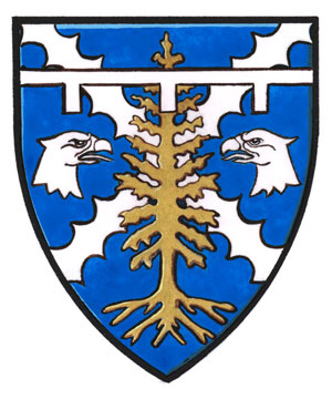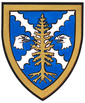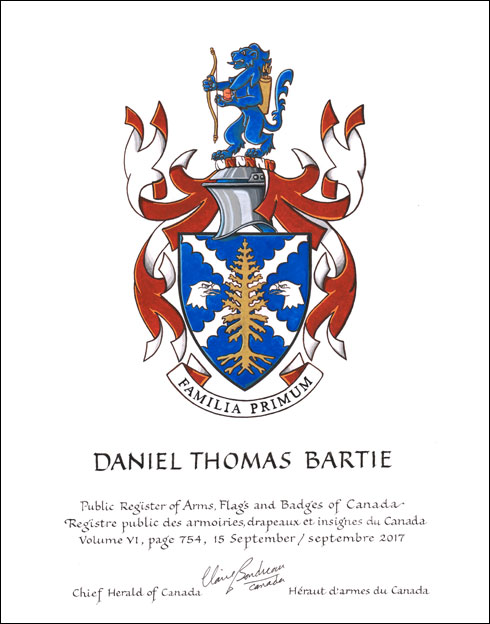 Armoiries de Daniel Thomas BartieBlasonD’azur au sautoir engrêlé accompagné en fasce de deux têtes d’aigle arrachées et affrontées, le tout d’argent, au sapin arraché d’or brochant; SymbolismeLa croix blanche sur le champ bleu fait allusion à l’Écosse, lieu de naissance du père de M. Bartie, et dont le drapeau est reconnu pour son sautoir. Le sautoir festonné est repris des armes du chef du clan Macfarlane, dont les Bartie forment l’une des branches. L’arbre, souvent utilisé en généalogie pour refléter les nombreuses branches d’une famille, symbolise les racines ancestrales. Aussi, le sapin est un symbole de la patience qui s’acquiert en composant avec les grandes questions de la vie avec force et courage. Les aigles font allusion aux expériences vécues par le père de M. Bartie au cours de la Deuxième Guerre mondiale et au record de vitesse aéronautique établi en 2000 par M. Bartie et son père entre Victoria et Prince Rupert, en Colombie Britannique. |