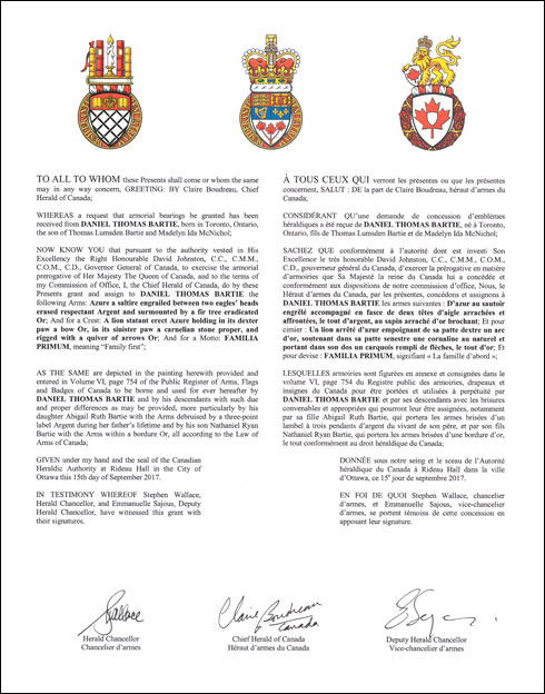 Concession d’armoiries, avec brisures à Abigail Ruth Bartie et à Nathaniel Ryan Bartie