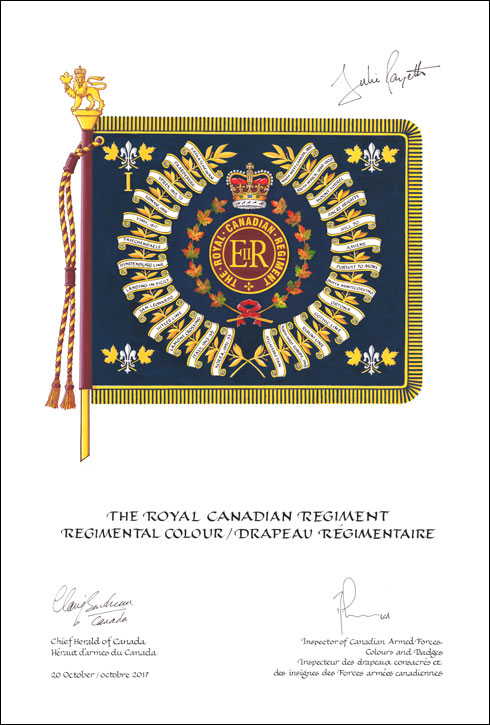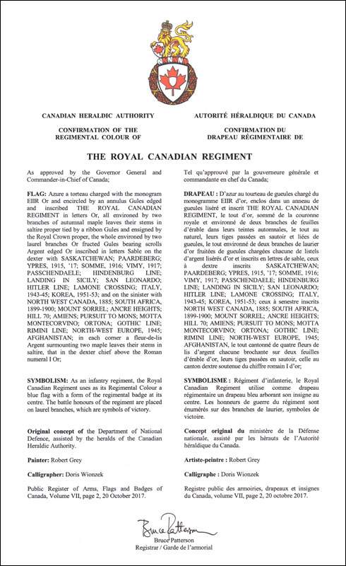 Drapeau régimentaire de The Royal Canadian RegimentBlasonD’azur au tourteau de gueules chargé du monogramme EIIR d’or, enclos dans un anneau de gueules liséré et inscrit THE ROYAL CANADIAN REGIMENT, le tout d’or, sommé de la couronne royale et environné de deux branches de feuilles d’érable dans leurs teintes automnales, le tout au naturel, leurs tiges passées en sautoir et liées de gueules, le tout environné de deux branches de laurier d’or fruitées de gueules chargées chacune de listels d’argent lisérés d’or et inscrits en lettres de sable, ceux à dextre inscrits SASKATCHEWAN; PAARDEBERG; YPRES, 1915, ’17; SOMME, 1916; VIMY, 1917; PASSCHENDAELE; HINDENBURG LINE; LANDING IN SICILY; SAN LEONARDO; HITLER LINE; LAMONE CROSSING; ITALY, 1943-45; KOREA, 1951-53; ceux à senestre inscrits NORTH WEST CANADA, 1885; SOUTH AFRICA, 1899-1900; MOUNT SORREL; ANCRE HEIGHTS; HILL 70; AMIENS; PURSUIT TO MONS; MOTTA MONTECORVINO; ORTONA; GOTHIC LINE; RIMINI LINE; NORTH-WEST EUROPE, 1945; AFGHANISTAN, le tout cantonné de quatre fleurs de lis d’argent chacune brochante sur deux feuilles d’érable d’or, leurs tiges passées en sautoir, celle au canton dextre soutenue du chiffre romain I d’or; SymbolismeRégiment d’infanterie, le Royal Canadian Regiment utilise comme drapeau régimentaire un drapeau bleu arborant son insigne au centre. Les honneurs de guerre du régiment sont énumérés sur des branches de laurier, symboles de victoire. |