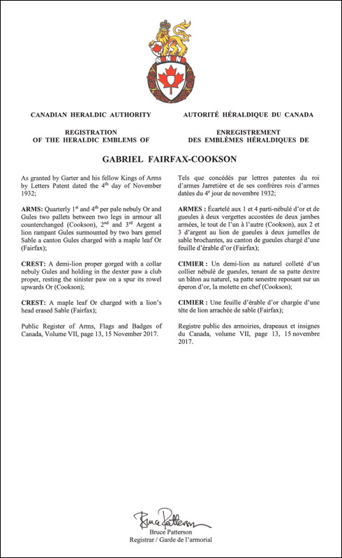Armoiries de Gabriel Fairfax-CooksonBlasonÉcartelé aux 1 et 4 parti-nébulé d’or et de gueules à deux vergettes accostées de deux jambes armées, le tout de l’un à l’autre (Cookson), aux 2 et 3 d’argent au lion de gueules à deux jumelles de sable brochantes, au canton de gueules chargé d’une feuille d’érable d’or (Fairfax); SymbolismeNon disponible. |