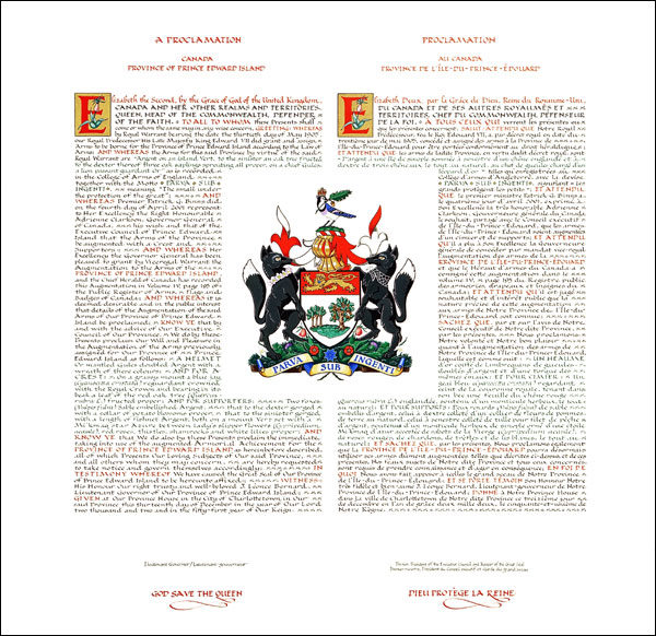 Armoiries de la Province de l'Île-du-prince-ÉdouardBlasonD'argent à une île de sinople sommée à senestre d'un chêne englandé et à dextre de trois chêneaux le tout au naturel, au chef de gueules chargé d'un léopard d'or; SymbolismeLe dessin de l’écu est inspiré de celui des grands sceaux délégués de l’Île-du-Prince-Édouard utilisés depuis 1769. Le chêne et les gaules rappellent la devise. Ils font ici référence à l’Île-du-Prince-Édouard qui était une petite colonie au sein de l’Empire britannique, et qui est aujourd’hui la plus petite province du Canada. Les trois gaules symbolisent également les trois comtés de la province. Quant au lion, il a été repris des armes royales et peut également être considéré comme une référence au prince Edward, duc de Kent, dont la province porte le nom. |