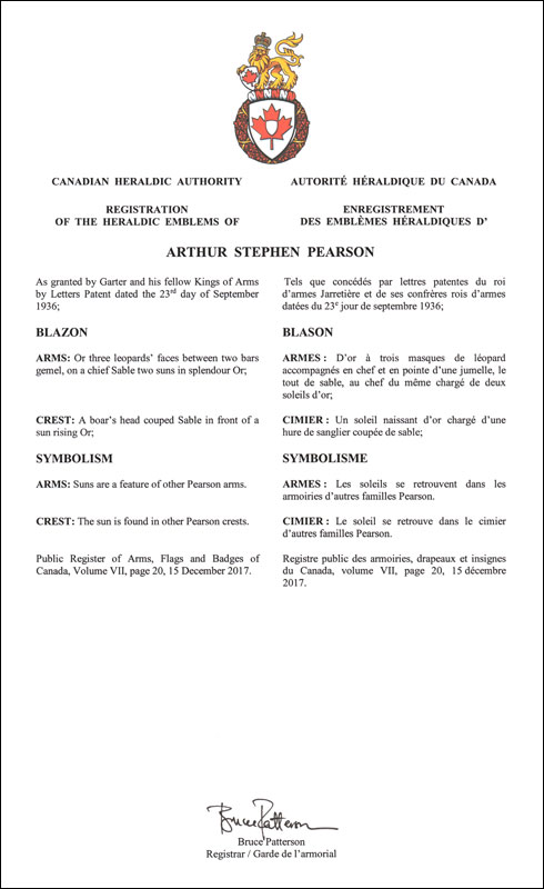 Armoiries de Arthur Stephen PearsonBlasonD’or à trois masques de léopard accompagnés en chef et en pointe d’une jumelle, le tout de sable, au chef du même chargé de deux soleils d’or; SymbolismeLes soleils se retrouvent dans les armoiries d’autres familles Pearson. |