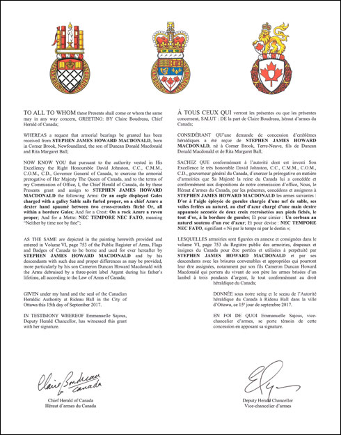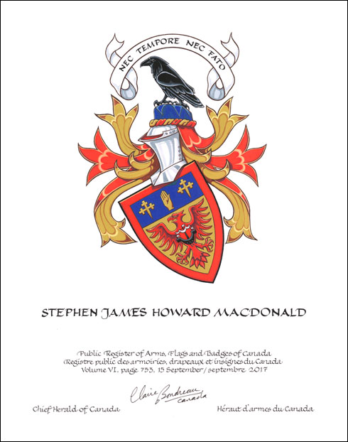 Armoiries de Stephen James Howard MacDonaldBlasonD’or à l’aigle éployée de gueules chargée d’une nef de sable, ses voiles ferlées au naturel, au chef d’azur chargé d’une main dextre appaumée accostée de deux croix recroisetées aux pieds fichés, le tout d’or, à la bordure de gueules; SymbolismeL’aigle éployée chargée d’une nef est tirée des armoiries du grand chef du clan Donald. La main et les croix proviennent de celles du chef des McDonell de Glengarry, l’une des cinq principales branches du clan Donald en Écosse. La bordure rouge représente une brisure écossaise pour un troisième fils. |