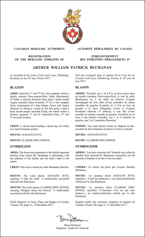 Lettres patentes enregistrant les emblèmes héraldiques d'Arthur William Patrick BuchananBlasonÉcartelé, aux 1 et 4 d’or au lion enclos dans un double trescheur floré-contre-floré, le tout de sable (Buchanan); au 2 de sable au chevron d’argent accompagné de trois têtes d’ours arrachées du même muselées de gueules (Lennie); au 3 d’or au lion de gueules à la fasce échiquetée d’azur et d’argent brochante (Stewart of Albany); à une tête d’ours arrachée au naturel, muselée de gueules, brochante sur le tout, à une bordure écartelée, aux 1 et 4 crénelée de gueules, aux 2 et 3 cannelée d’hermine; SymbolismeLes trois armoiries de l’écartelé sont celles de familles dont descend M. Buchanan, auxquelles ont été ajoutées la bordure et la tête d’ours au centre. |