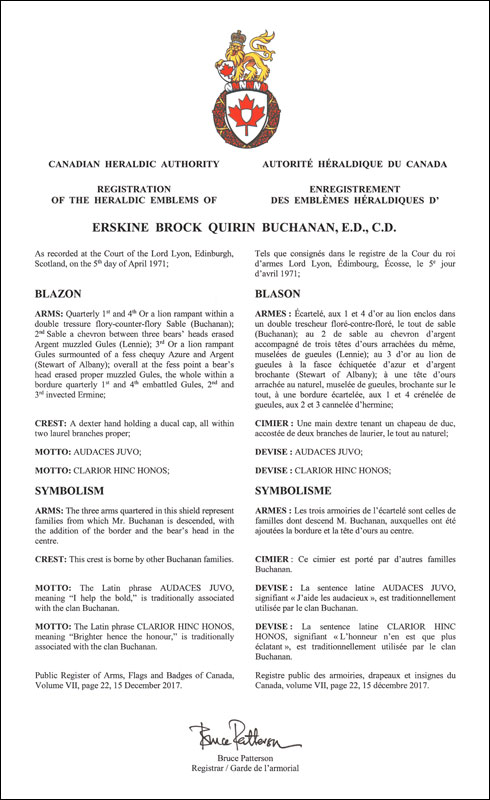 Lettres patentes enregistrant les emblèmes héraldiques d'Erskine Brock Quirin BuchananBlasonÉcartelé, aux 1 et 4 d’or au lion enclos dans un double trescheur floré-contre-floré, le tout de sable (Buchanan); au 2 de sable au chevron d’argent accompagné de trois têtes d’ours arrachées du même, muselées de gueules (Lennie); au 3 d’or au lion de gueules à la fasce échiquetée d’azur et d’argent brochante (Stewart of Albany); à une tête d’ours arrachée au naturel, muselée de gueules, brochante sur le tout, à une bordure écartelée, aux 1 et 4 crénelée de gueules, aux 2 et 3 cannelée d’hermine; SymbolismeLes trois armoiries de l’écartelé sont celles de familles dont descend M. Buchanan, auxquelles ont été ajoutées la bordure et la tête d’ours au centre. |