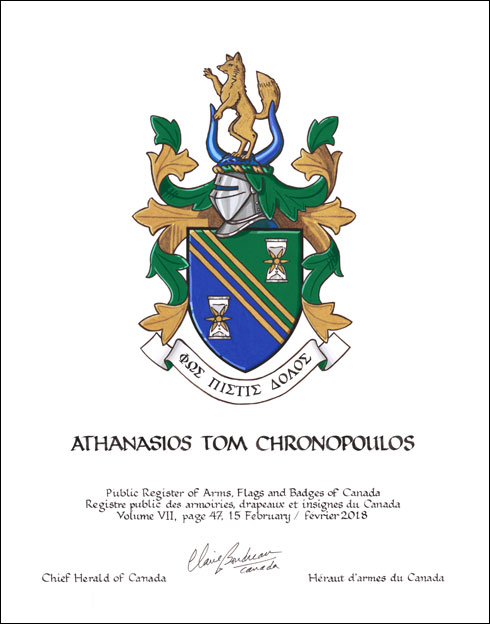 Armoiries d'Athanasios Tom ChronopoulosBlasonTranché de sinople et d’azur à trois cotices d’or accompagnées de deux sabliers d’argent chargés chacun d’un soleil de Vergina à six rais d’or; SymbolismeLe sablier et le soleil sont des marqueurs de temps (chronos en grec), font écho au nom de M. Chronopoulos. Le soleil représente également la lumière et la sagesse, et le sablier fait aussi référence aux vertus de la fiabilité et de la constance. Le vert évoque la nature et une vie saine, tandis que le bleu représente la quiétude, une nature apaisante. |