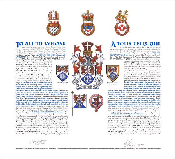 Concession d’armoiries, d’un drapeau et d’un insigne, avec brisures à Jacob Harley Vaughan et à Jordan Louis Vaughan