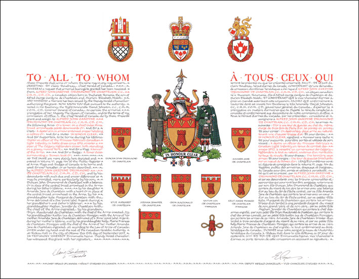 Concession d’armoiries, de supports, d’un drapeau et d’un insigne, avec brisures à Duncan John Drummond de Chastelain, à Amanda Jane de Chastelain, à Kylie Margaret de Chastelain, à Meghan Jennifer de Chastelain, à Bryn Macdonald de Chastelain, à Kaitlin Lea de Chastelain Finnigan et à Kelly Marie Frances de Chastelain Finnigan