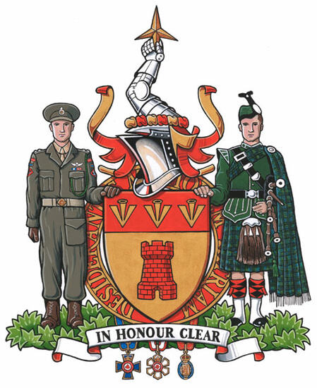 DeviseBlasonIN HONOUR CLEAR; SymbolismeCette sentence signifiant « Honneur sans tache » est tirée de la devise de l’Ordre des compagnons d’honneur, « Fidélité sans faille et honneur sans tache », dont le général de Chastelain est membre, et fait partie d’un poème d’Alexander Pope (Épître VII, À M. Addison). |
