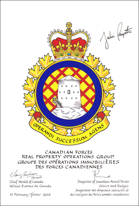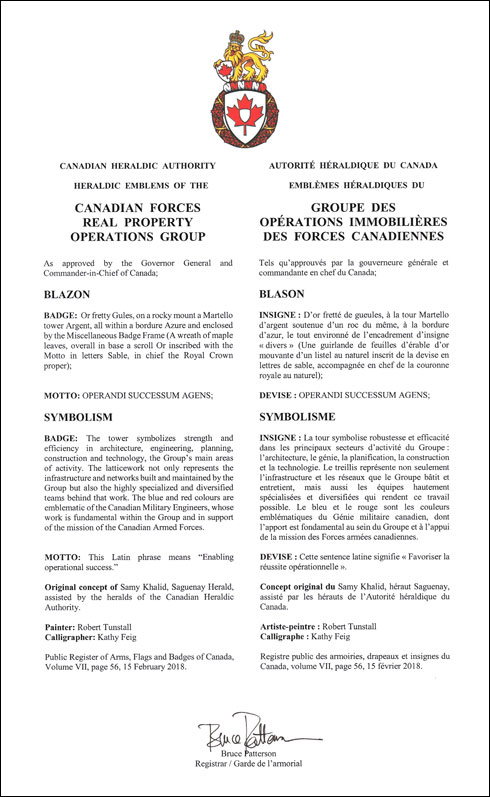 insigne du Groupe des opérations immobilières des forces canadiennesBlasonD’or fretté de gueules, à la tour Martello d’argent soutenue d’un roc du même, à la bordure d’azur, le tout environné de l’encadrement d’insigne « divers » (Une guirlande de feuilles d’érable d’or mouvante d’un listel au naturel inscrit de la devise en lettres de sable, accompagnée en chef de la couronne royale au naturel); SymbolismeLa tour symbolise robustesse et efficacité dans les principaux secteurs d’activité du Groupe : l’architecture, le génie, la planification, la construction et la technologie. Le treillis représente non seulement l’infrastructure et les réseaux que le Groupe bâtit et entretient, mais aussi les équipes hautement spécialisées et diversifiées qui rendent ce travail possible. Le bleu et le rouge sont les couleurs emblématiques du Génie militaire canadien, dont l’apport est fondamental au sein du Groupe et à l’appui de la mission des Forces armées canadiennes. |