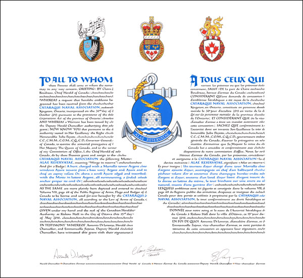 Insigne de la Cataraqui Naval AssociationBlasonUn tourteau d’azur chargé d’une tour Martello d’argent ajourée d’azur, accompagnée en chef d’un balbuzard pêcheur volant d’or et soutenue d’une champagne burelée-ondée d’argent et d’azur, soutenu d’un listel d’azur liséré d’argent inscrit de la devise en lettres du même, le tout brochant sur une ancre au naturel, munie d’une gumène d’or; SymbolismeLe balbuzard, un oiseau de proie fréquentant la région de Kingston, rend hommage à l’escadron aérien VC 921 qui est entré en service en 1953 comme auxiliaire au Navire canadien de Sa Majesté Cataraqui. La tour Martello rappelle que l’escadron menait ses activités à partir de l’aéroclub de Kingston jusqu’à son démantèlement en 1959. L’ancre symbolise l’histoire navale de l’association. |
