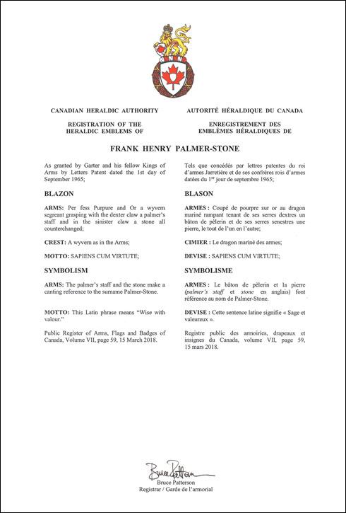 Armoiries de Frank Henry Palmer-StoneBlasonCoupé de pourpre sur or au dragon mariné rampant tenant de ses serres dextres un bâton de pèlerin et de ses serres senestres une pierre, le tout de l’un en l’autre; SymbolismeLe bâton de pèlerin et la pierre (palmer’s staff et stone en anglais) font référence au nom de Palmer-Stone. |