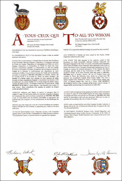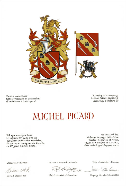 Armoiries de Michel PicardBlasonDe gueules à la bande ondée d'or chargée de trois maisons de sable, accostée de deux arquebuses d'argent; SymbolismeLa bande ondée rappelle l’océan Atlantique que les ancêtres de Monsieur Picard ont traversé pour venir s’établir en Nouvelle-France. Les trois maisons figurant sur la bande ondée font allusion au patronyme « Des Trois-Maisons » nom que portaient les ancêtres de Monsieur Picard. Les arquebuses rappellent leur métier, ils étaient fondeurs et confectionnaient des canons d’arquebuses. |