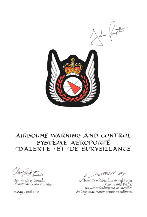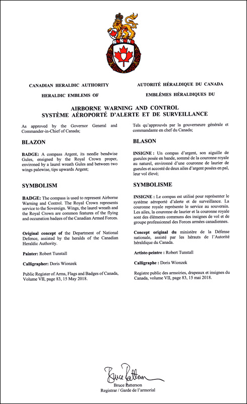 Insigne du Système aéroporté d’alerte et de surveillance des Forces armées canadiennesBlasonUn compas d’argent, son aiguille de gueules posée en bande, sommé de la couronne royale au naturel, environné d’une couronne de laurier de gueules et accosté de deux ailes d’argent posées en pal, leur vol élevé; SymbolismeLe compas est utilisé pour représenter le système aéroporté d’alerte et de surveillance. La couronne royale représente le service au souverain. Les ailes, la couronne de laurier et la couronne royale sont des éléments communs des insignes de vol et de groupe professionnel des Forces armées canadiennes. |