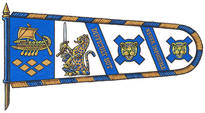 Drapeau de Fred GeorgeBlasonUn étendard, au guindant aux armes, au battant d’argent chargé du cimier et de deux représentations de l’insigne, le tout séparé par deux bandes d’azur inscrites de la devise en lettres d’or; SymbolismeLe symbolisme de cet emblème est compris dans un ou plusieurs éléments de ce dossier. |